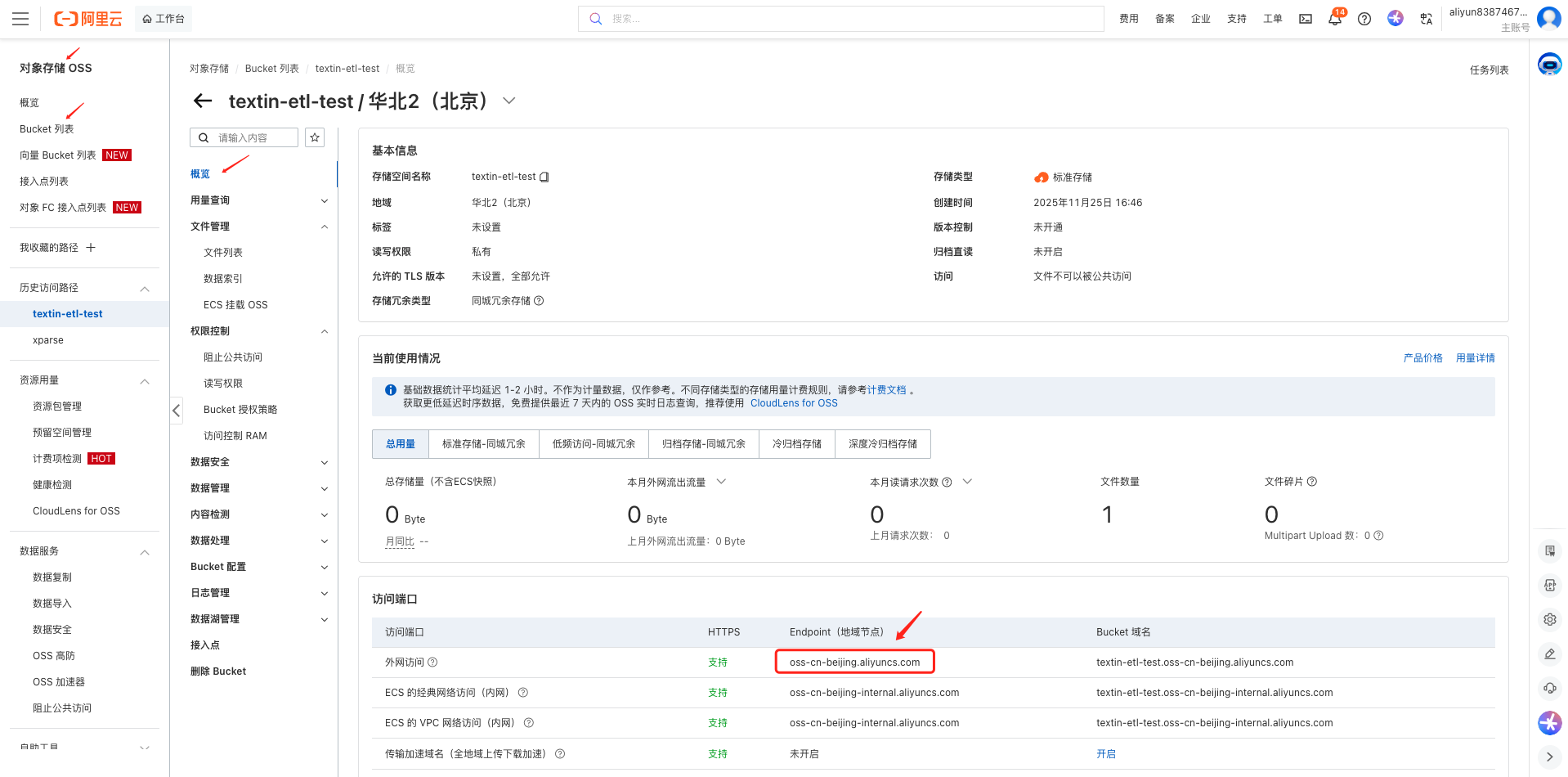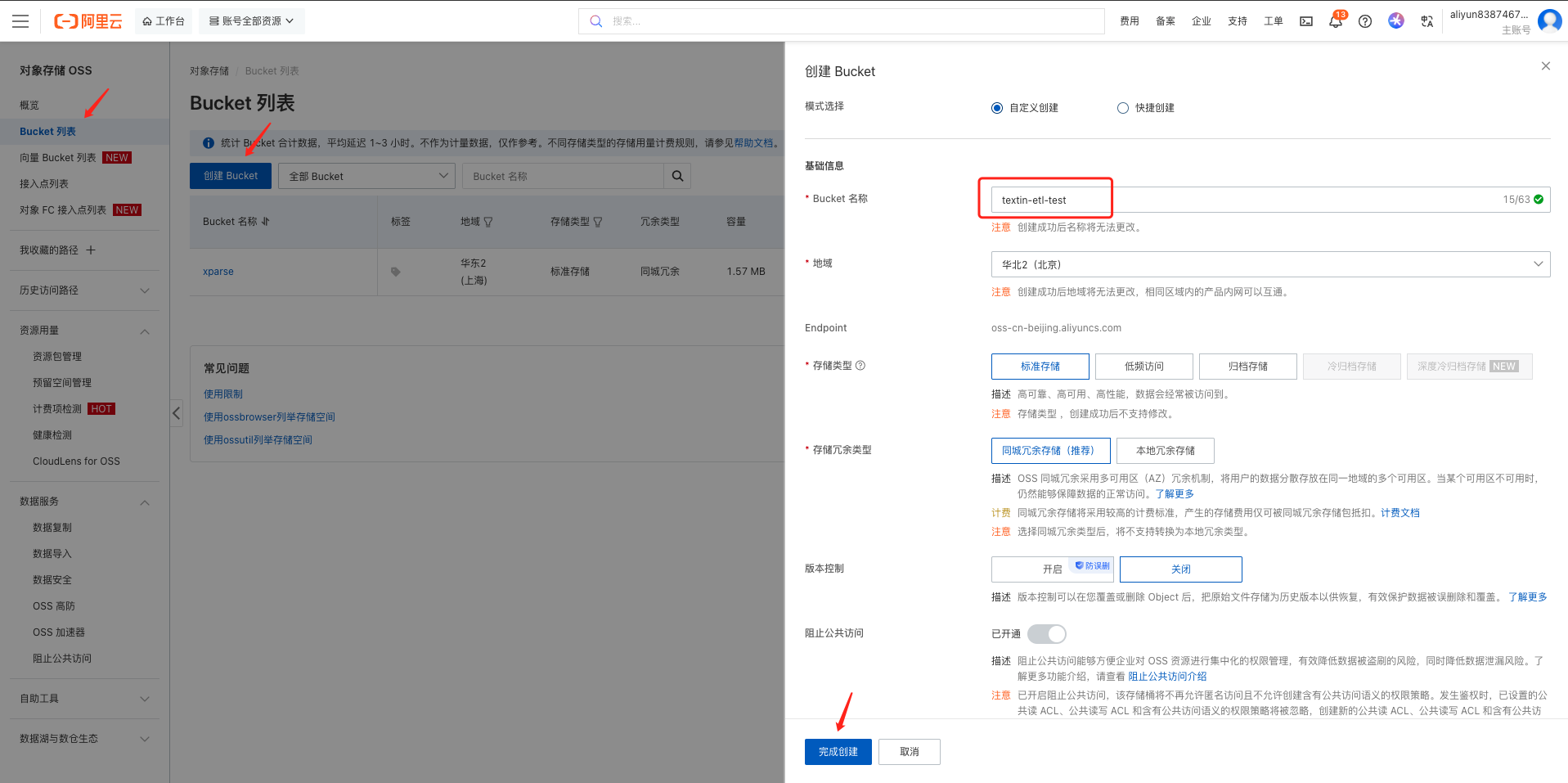 - 进入 OSS 服务,创建存储桶(Bucket)