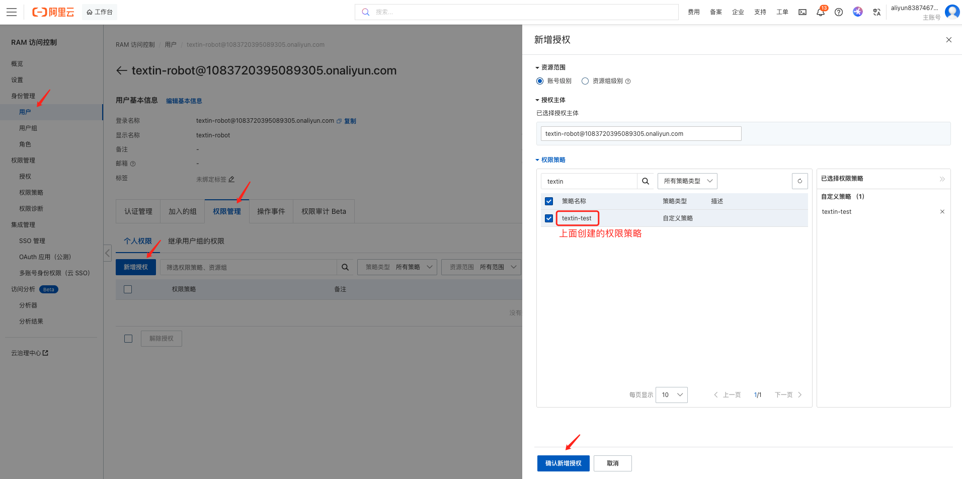 - 进入”访问控制 RAM” → “用户” → 创建用户或使用现有用户