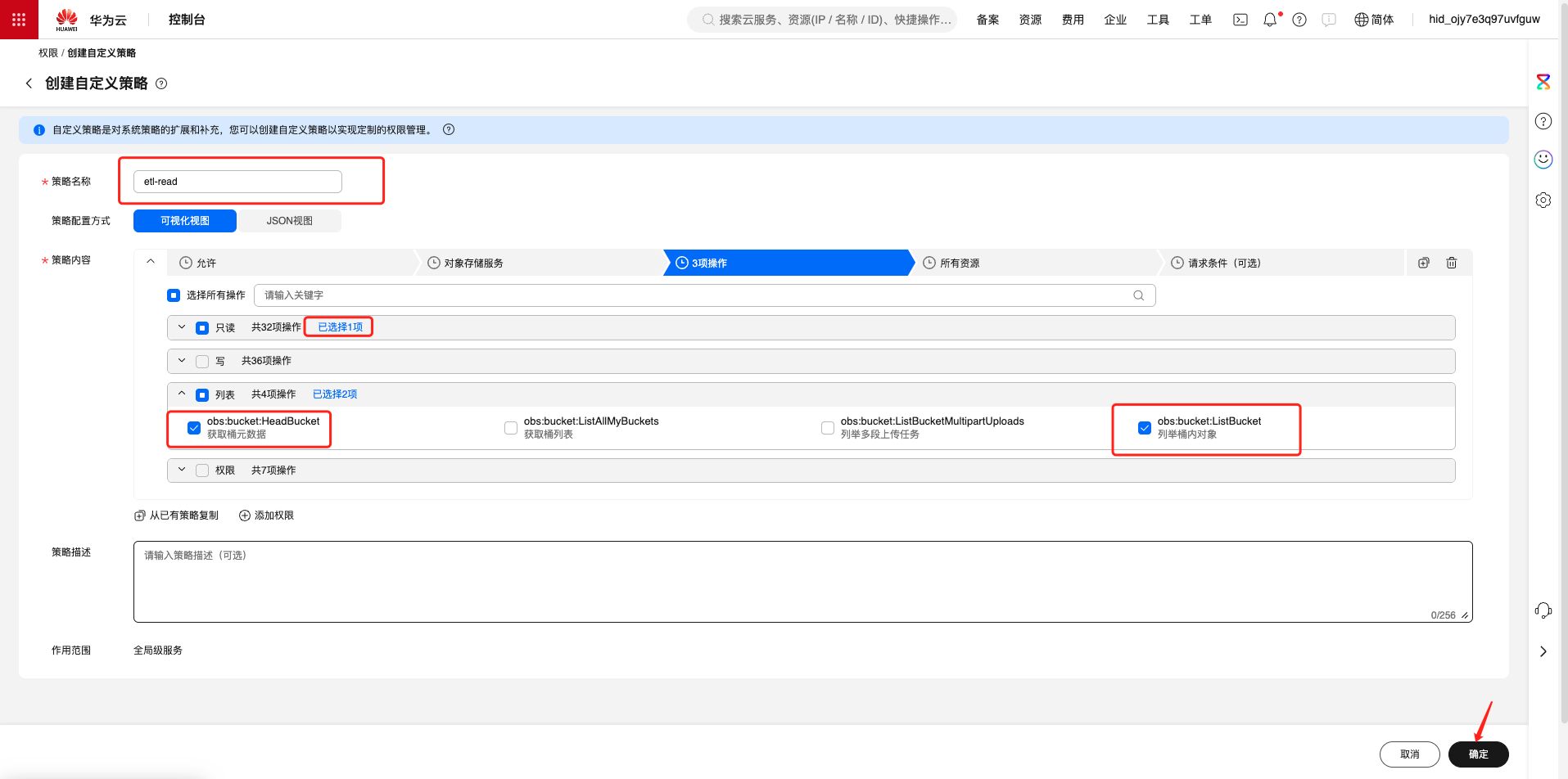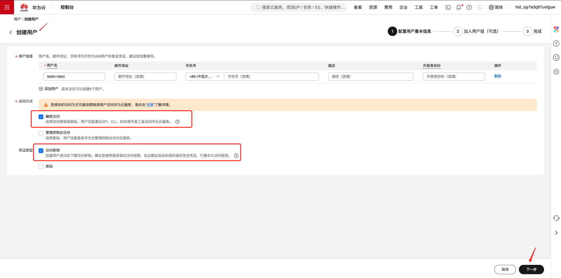 - 进入”统一身份认证服务(IAM)” → “用户” → 创建用户或使用现有用户